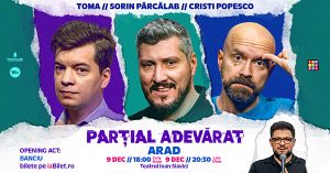 Stand-up comedy-ul românesc este pe val, iar trei dintre cele mai puternice nume ale genului – Sorin Pârcălab, Cristi Popesco și Toma – anunță o revenire fulminantă la Arad. După ce în 2024 au înregistrat zeci de spectacole SOLD OUT în cadrul turneului „Regrete”, artiștii se pregătesc să cucerească din nou publicul arădean cu cel mai nou și promițător spectacol al lor: „Parțial Adevărat”.