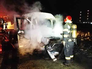 UPDATE: „La locul evenimentului a fost alocată și o ambulanță de la Serviciul de Ambulanță Județean Arad. Echipajul medical a acordat îngrijiri medicale pentru două persoane aflate în microbuz. Este vorba despre o femeie și un bărbat, ambii în vârstă de aproximativ 40 de ani, care au suferit arsuri. Aceștia au fost preluați conștienți și cooperanți de la locul evenimentului și transportați la spital pentru îngrijiri și investigații medicale. În microbuz se mai afla o persoană care nu a avut nevoie de îngrijiri medicale. Toate cele trei persoane s-au autoevacuat înainte de sosirea echipajelor de intervenție. Incendiul a fost stins prompt, însă autovehiculul a fost afectat în totalitate”, a declarat Ruxandra Klein, Inspectoratul pentru Situații de Urgență Arad.
